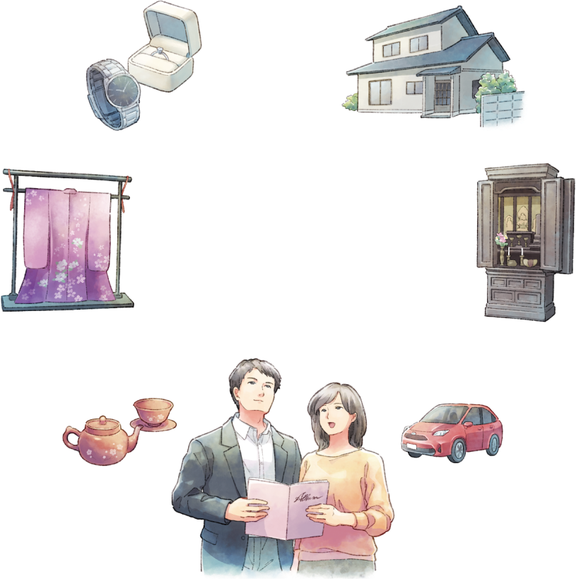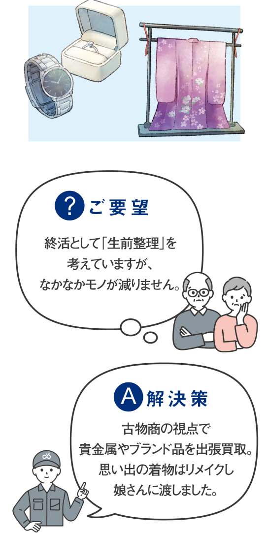 生前整理に伴う貴重品・リユース品の買取、不要品の回収、整理収納アドバイス、引越しをサポートします。