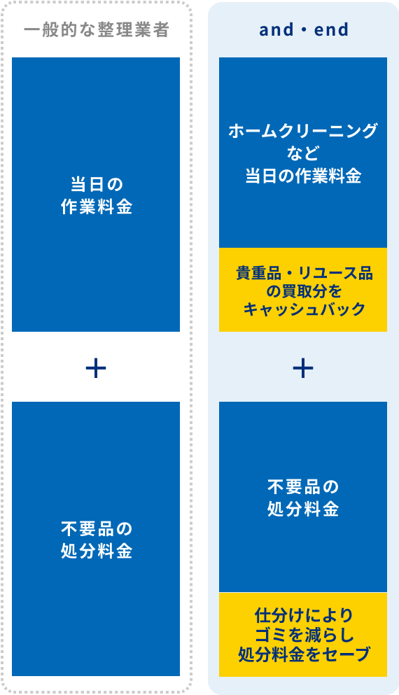 主な料金は「仕分け・回収・ホームクリーニング作業」と「不要品の処分」。そこから、丁寧に査定した「貴重品・リユース品」の買取分を、キャッシュバック。できるだけお客様の負担を減らし、モノと思い出を大切にするand・endの料金システムです。